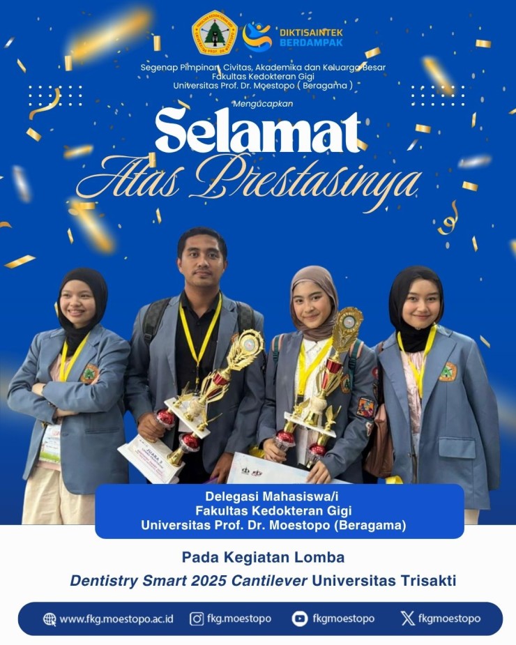 Jakarta, 15 November 2025 – Fakultas Kedokteran Gigi Universitas Prof. Dr. Moestopo (Beragama) kembali menorehkan prestasi membanggakan setelah berhasil meraih juara dalam ajang Dentistry Smart (DENSMART) 2025 dengan tema “Cantilever” (Challenging Dentist of Tomorrow to Excel through Clinical and Theoretical Versatility) yang diselenggarakan Universitas Trisakti bertempat di Kampus B, Universitas Trisakti, Jakarta.